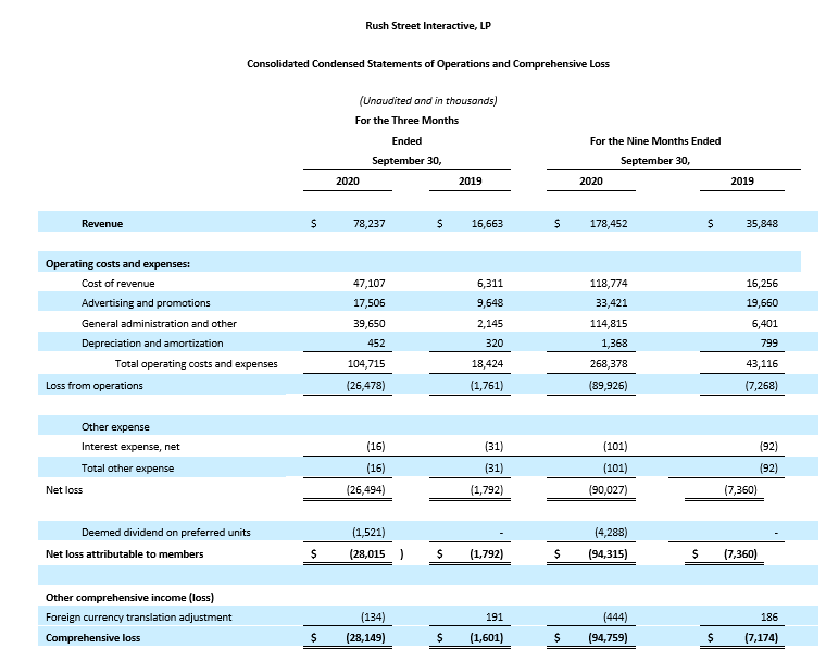 CHICAGO- Rush Street Interactive, LP (“RSI” or the “Company”), one of the fastest-growing online casino and sports betting gaming companies in the United States, today announced financial results for the third quarter ended September 30, 2020.